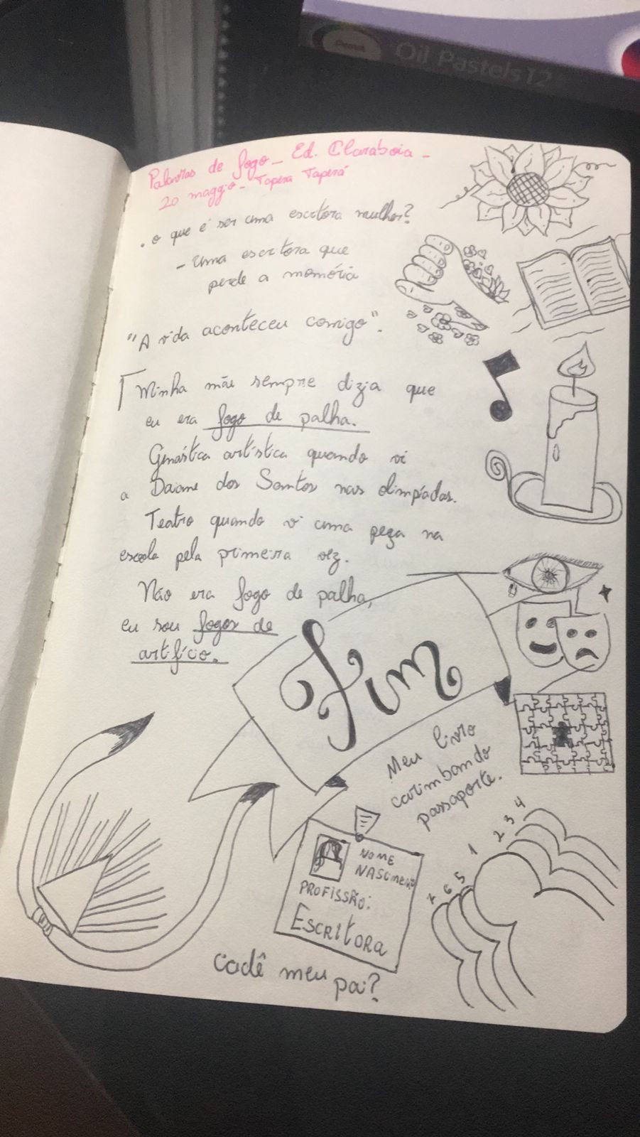 Pois agora na vida adulta não tenho mais esse espaço sagrado da escola em que sou obrigada a ficar totalmente entregue ao exercício da concentração, seja ela na aula ou nas minhas ideias criativas. Quer dizer, eu continuo na escola. Sou Professora. A diferença agora é que o tempo-espaço é do capital, o que me obriga a estar ali concentrada para oferecer o melhor serviço. Não tem verso do caderno pra mim.